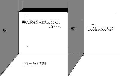 (↑ クローゼット内部の図です。このタンス側の奥の方に猫は閉じ込められていました。)